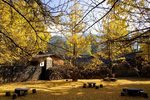 古老而古樸的銀杏樹,有聲有息,隱於(yu) 群山環抱,現於(yu) 農(nong) 莊炊煙之間,沒有太多人的打擾,沒有太多的俗氣,更沒有絲(si) 毫的商業(ye) 氣息。沿著江東(dong) 村由火山石鋪成的小道,慢慢走進古銀杏村時,一地金黃,小路上、牆頭上、瓦房上、水溝邊、菜地裏,漫步村中小巷,不經意間,銀杏葉灑滿一身,與(yu) 夕陽的餘(yu) 輝融為(wei) 一體(ti) ……