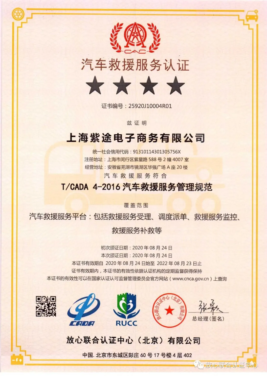 途虎救援提出認證申請,通過嚴(yan) 格審核後,確認於(yu) 2020年08月24日通過認證。汽車救援服務認證是依據中國汽車流通協會(hui) 在2016年7月15日發布的團體(ti) 標準T/CADA 4-2016 《汽車救援服務管理規範》對汽車救援企業(ye) 進行國家級認證。