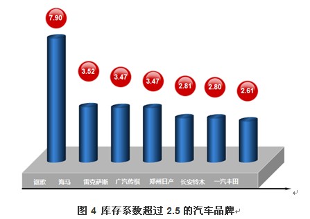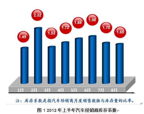 2012年9月26日,中國汽車流通協會對外發布2012年8月份“汽車經銷商庫存調查結果”。調查顯示,汽車經銷商庫存連續2月下降,8月份綜合庫存係數微降至1.65,但仍高於1.5的警戒水平;與7月份相比,自主、合資和進口品牌庫存係數均呈現微幅下降;高庫存(庫存係數大於2.5)品牌7個,比上月的10個有所減少;8月份庫存係數最高的品牌是謳歌,庫存係數為7.90。