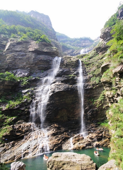這裏水聲隆隆的,砸在下麵的潭水裏頗有氣勢,據說這潭叫作“龍潭”。龍潭裏有幾隻小船可以劃,很多遊客就在清澈的水裏玩耍,劃船啊,玩水啊,拍照啊,大家玩得不亦樂(le) 乎。若是想把三疊泉完整地拍攝下來那可要費點心思了,第一次來這裏需要嚐試不同的角度拍攝。