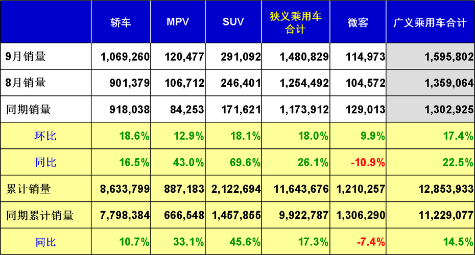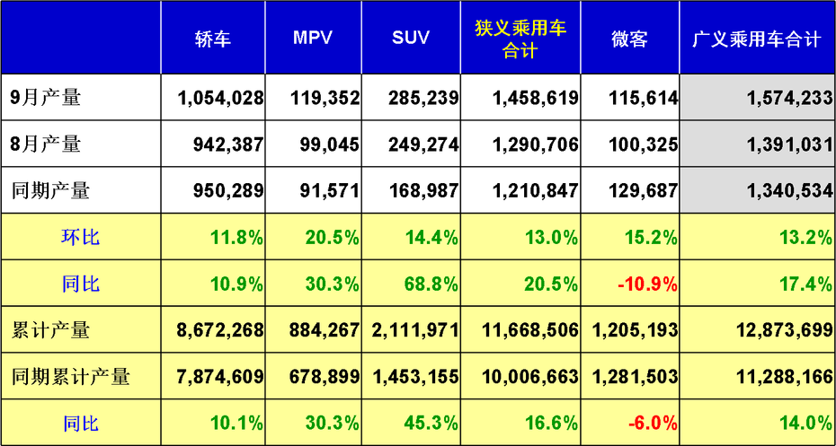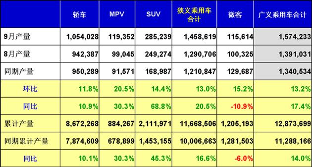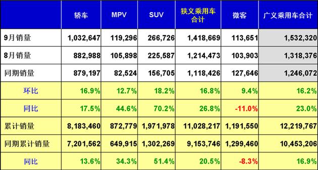 乘聯會(hui) 發布了9月份市場產(chan) 銷分析,9月份廣義(yi) 批發銷量159.6萬(wan) 輛,同比上漲22.5%,環比上月銷量上漲17.4%。其中,國內(nei) 銷量153.2萬(wan) 輛,同比增長23%,環比增長16.2%。其中,狹義(yi) 實現批發銷量達148.1萬(wan) 輛,同比增長26.1%,環比增長18.1%,。乘聯會(hui) 認為(wei) ,每到金9車市自然會(hui) 好,從(cong) 月初到月底市場銷量同比和環比均是大幅上漲。由於(yu) 9月底補貼暫停,抬高了9月份的銷量。由於(yu) 9月市場太火,本月出現了銷大於(yu) 產(chan) 的情況,廠家庫存大幅減少,但在季度末,的庫存也增加,不過比預想的小一些。
