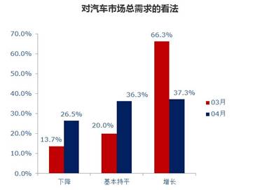 調查顯示:約37%的經銷商認為4月汽車市場總需求比3月會有下降,下降比例從3月份的66.3%降至37.0%。在經濟複蘇依舊緩慢的大背景下,車市需求不旺。3月份廠商對老車型大幅降價預支了部分需求。4月上海車展新車迭出加重消費者觀望情緒。因此,4月份汽車總需求量穩中有降,汽車市場回暖速度較為遲緩。