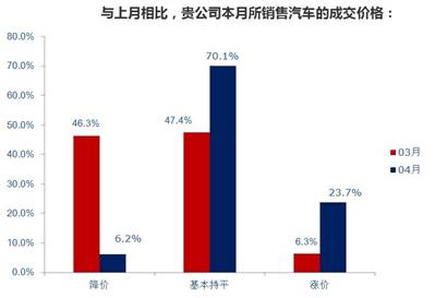 4月,終端成交價格環比基本持平。經銷商認為成交價格“下降”的比例隻有6.2%,比上月的46.3%大幅減少。認為“漲價”的比例從上月的6.3%增至23.7%,上漲的比例有所增長,認為“基本持平”的比例從上月47.4%增至70.1%。數據表明,由於4月新車大量上市,導致市場價格有所回升。