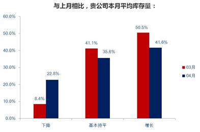 與上月相比,4月庫存小幅下降,經銷商認為庫存量“增長”的比例從50.5%小幅降至41.6%;“基本持平”的比例從41.4%降至35.6%;認為“下降”的比例從8.4%增至22.8%。數據表明,由於4月份經銷商加大了老車型的降價促銷力度,有效地消化了部分庫存。總體來說,4月經銷商庫存壓力相對有所緩解。