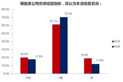 本月汽車經銷商的經營狀況一般,但總體呈向好趨勢。與3月車市相比,隨著市場的逐步回暖,經營狀況“一般”的企業從61.1%升至70.3%;經營狀況“好”的比例略有下降從上月的18.9%降至11.9%;經營狀況“不好”的比例從上月的20.0%下降至17.8%。