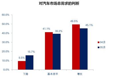 由於5·1小長假迎來新一輪消費增長,上海車展效應及各地方春季車展增多,季節轉暖帶動自駕遊升溫,加之廠家促銷力度進一步加大,新車集中上市等因素影響,經銷商對5月汽車總需求判斷“增長”預期總體向好,認為5月汽車總需求“增長”和“基本持平”的比例最多,為45.1%和39.2%,但“增長”預期有所回落。