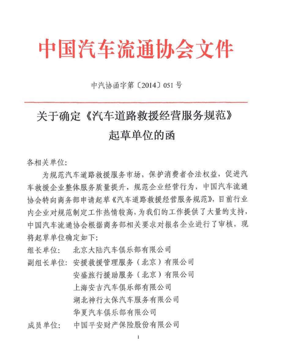 為規範汽車道路救援服務市場,保護消費者合法權益,促進汽車救援企業整體服務質量提升,規範企業經營行為,中國汽車流通協會特向商務部申請起草《汽車道路救援經營服務規範》,目前行業內企業對規範製定工作熱情較高,為我們的工作提供了大量的支持,中國汽車流通協會根據商務部相關要求對報名企業進行了審核,函件如下: