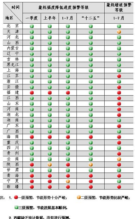 與(yu) “十二五”節能工作進度要求相比較,海南、青海、寧夏、新疆等4個(ge) 地區預警等級為(wei) 一級,陝西預警等級為(wei) 二級,北京、天津、河北、山西、內(nei) 蒙古、遼寧、吉林、黑龍江、上海、江蘇、浙江、安徽、福建、江西、山東(dong) 、河南、湖北、湖南、廣東(dong) 、廣西、重慶、四川、貴州、雲(yun) 南、甘肅等25個(ge) 地區預警等級為(wei) 三級。與(yu) 上半年相比,福建由二級預警下降為(wei) 三級預警。