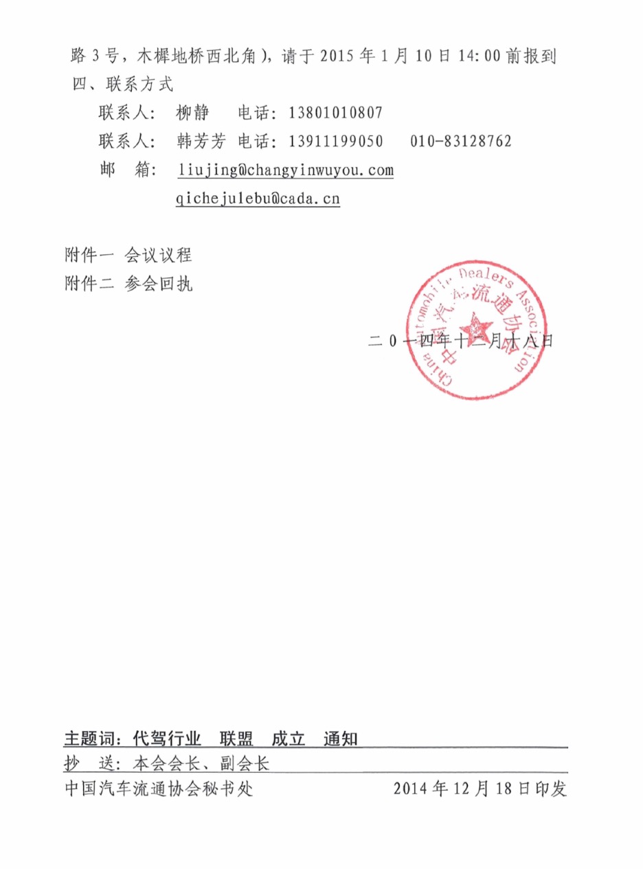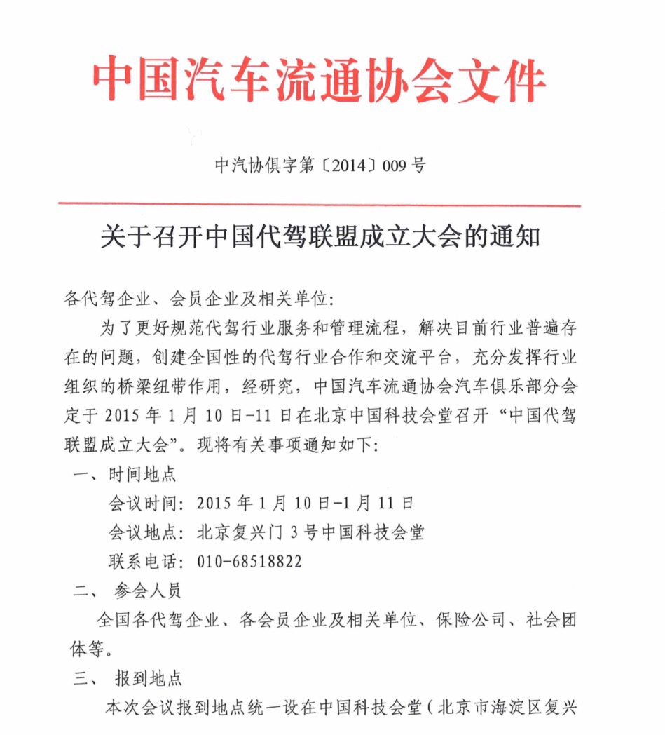 2015年1月10日-11日由华体会体育hth首页組織發起的“中國代駕聯盟成立大會”將在北京隆重召開。本次代駕聯盟的成立,是為了更好規範代駕行業服務和管理流程,解決目前行業普遍存在的規模小、管理不規範、無序競爭等問題,創建全國性的代駕行業合作和交流平台,充分發揮行業組織的橋梁紐帶作用,參照由協會編製的目前已上報商務部審核的《代駕經營服務規範》,在代駕行業持證上崗、代駕專業保險、代駕安全責任等方麵提出具體的要求。具體會議通知如下,會議議程及回執表詳見網站下載處。
