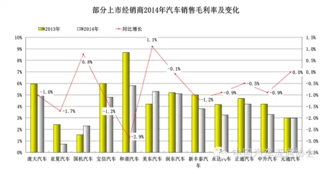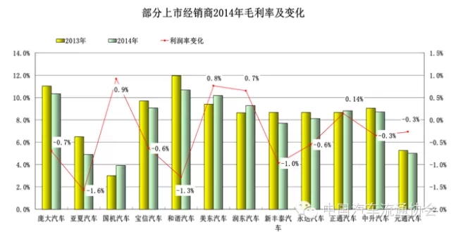 2014年上市汽車經銷商集團汽車銷售毛利率除美東(dong) 、國機、元通汽車相比2013年有所增加或持平外,其餘(yu) 企業(ye) 汽車銷售毛利率均有不同程度下降,最多下降2.9個(ge) 百分點,各上市企業(ye) 汽車銷售毛利率平均下降了0.71個(ge) 百分點。