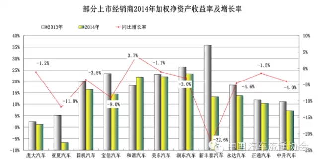 11家上市經銷商集團加權淨資產(chan) 收益率除和諧汽車較2013年保持正增長外,其餘(yu) 企業(ye) 同比均有不同程度下降,平均下降3.28個(ge) 百分點。數據表明上市汽車經銷商集團2014年整體(ti) 盈利能力下降明顯。