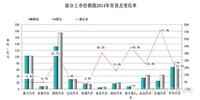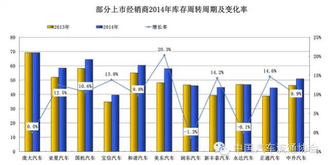 2014年度大部分企業(ye) 期末庫存較期初有所增加,最高增幅達71.9%,上市集團期末庫存整體(ti) 較期初增加了20.91%。庫存絕對量的增加,一部分是由於(yu) 企業(ye) 營業(ye) 規模擴大、營業(ye) 網點擴張帶來的合理庫存增加,另一部分則是由於(yu) 當前汽車市場存在產(chan) 能過度釋放與(yu) 需求相對不足的矛盾,同時受到我國汽車產(chan) 銷體(ti) 製的影響,使汽車經銷商背負了大部分過剩產(chan) 能。