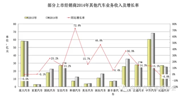 圖12 部分上市經銷商2014年汽車相關(guan) 業(ye) 務收入及增長率