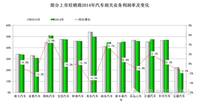 圖13 部分上市經銷商2014年汽車相關(guan) 業(ye) 務利潤率及變化