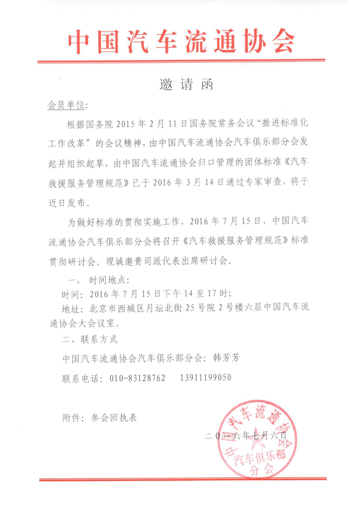由中國汽車流通協會(hui) 歸口管理的團體(ti) 標準《汽車救援服務管理規範》即將發布,為(wei) 做好標準貫徹實施工作,2016年7月15日,华体会体育hth首页將召開《汽車救援服務管理規範》標準貫徹研討會(hui) 。