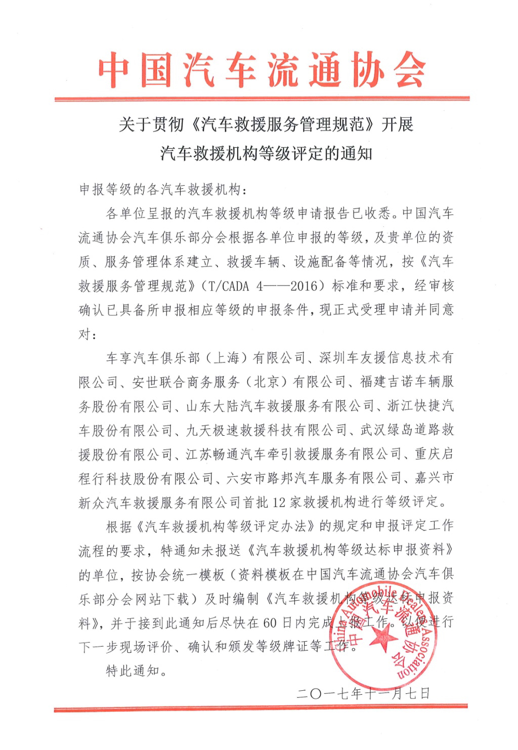 導讀:各單位呈報的汽車救援機構等級申請報告已收悉。华体会体育hth首页根據各單位申報的等級,及貴單位的資質、服務管理體係建立、救援車輛、設施配備等情況,按《汽車救援服務管理規範》(T/CADA 4—2016)標準和要求,經審核確認已具備所申報相應等級的申報條件,現正式受理申請並通知如下: